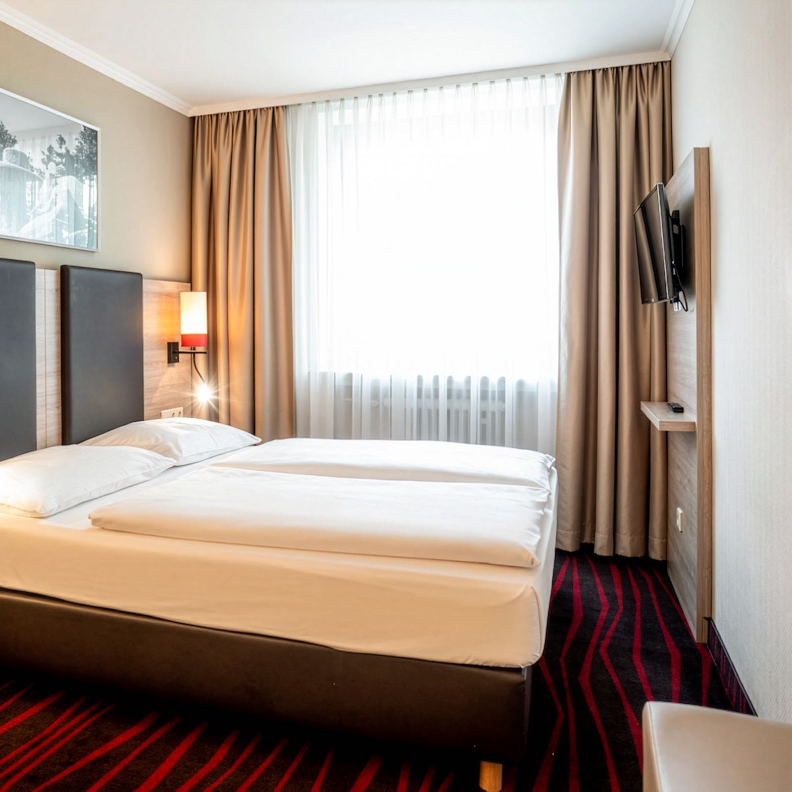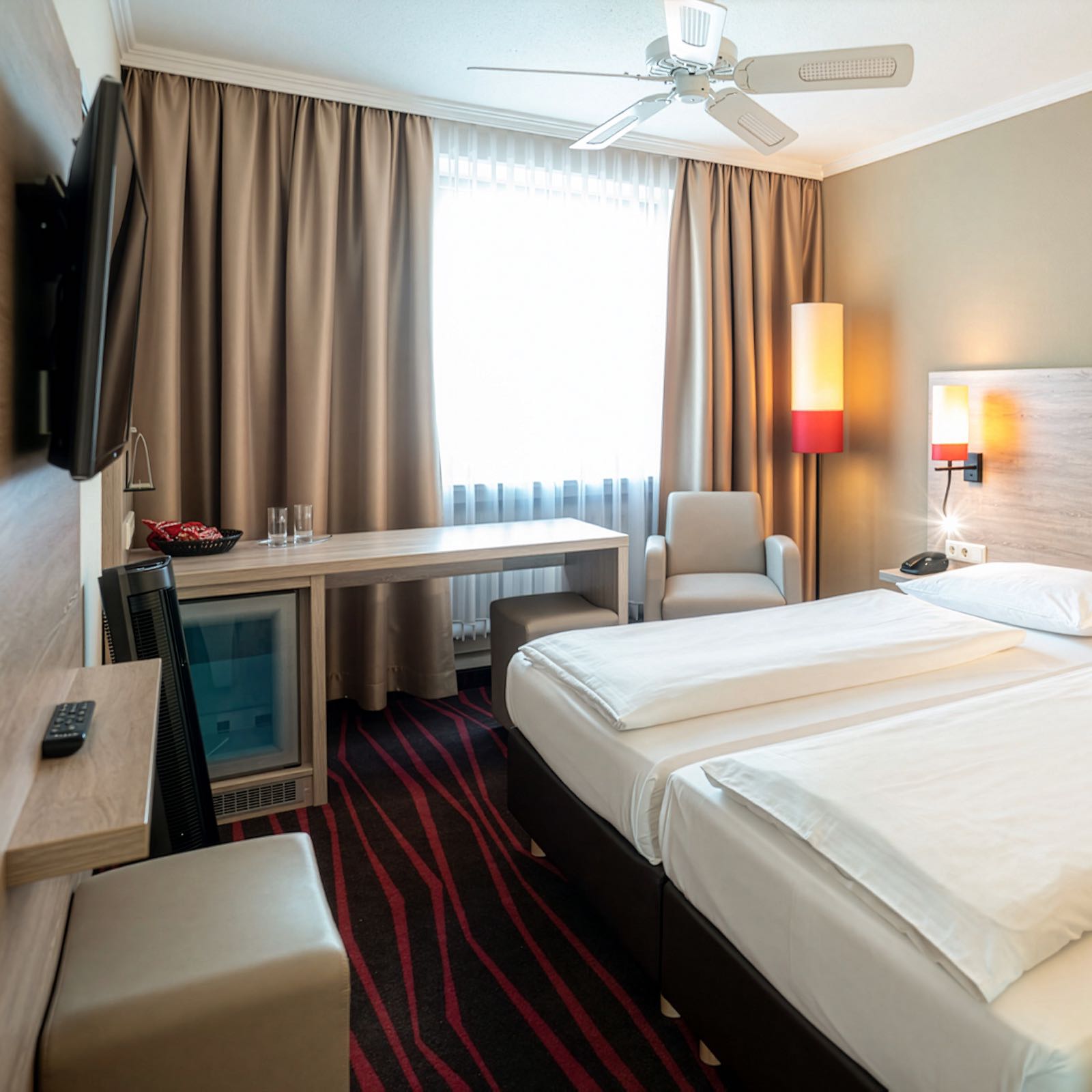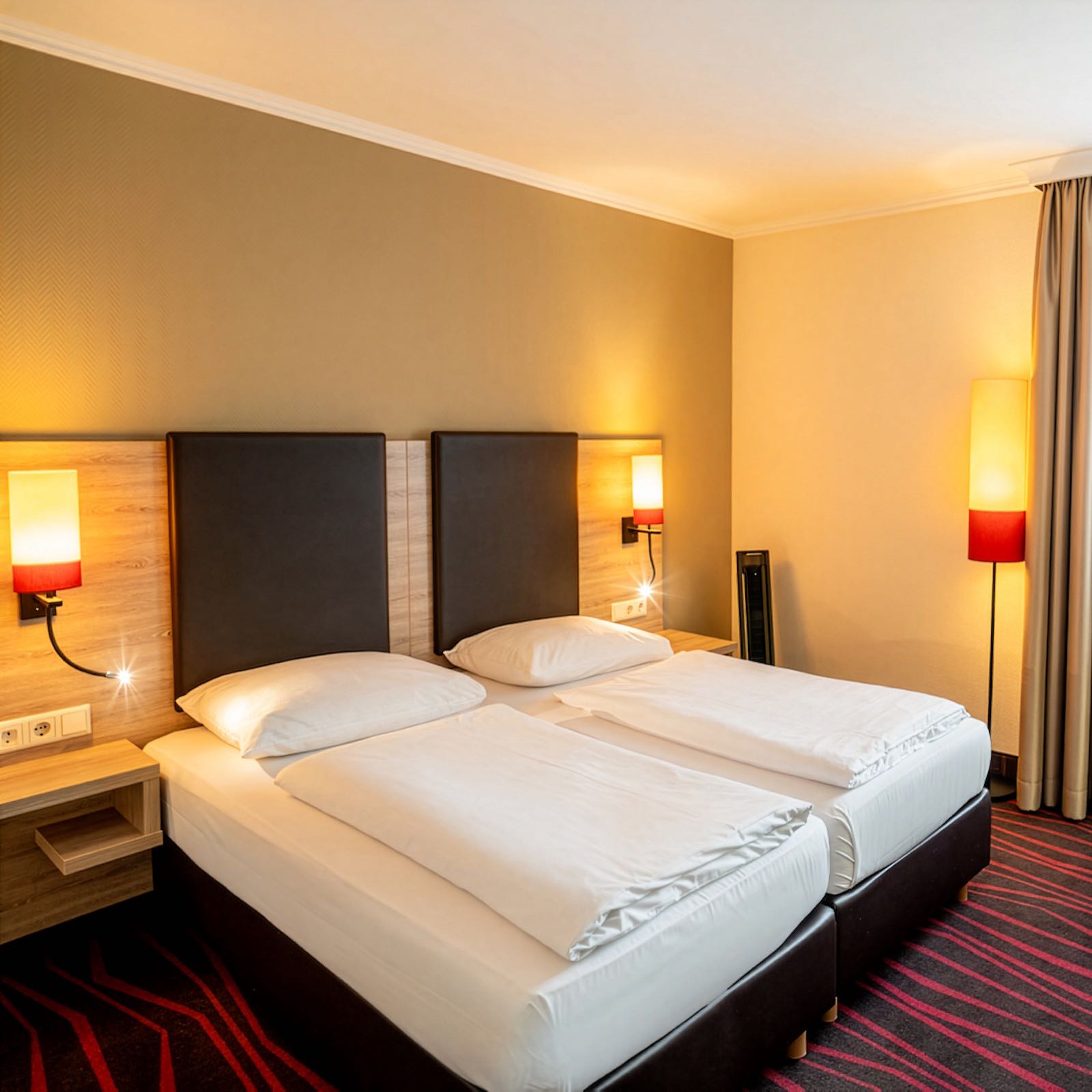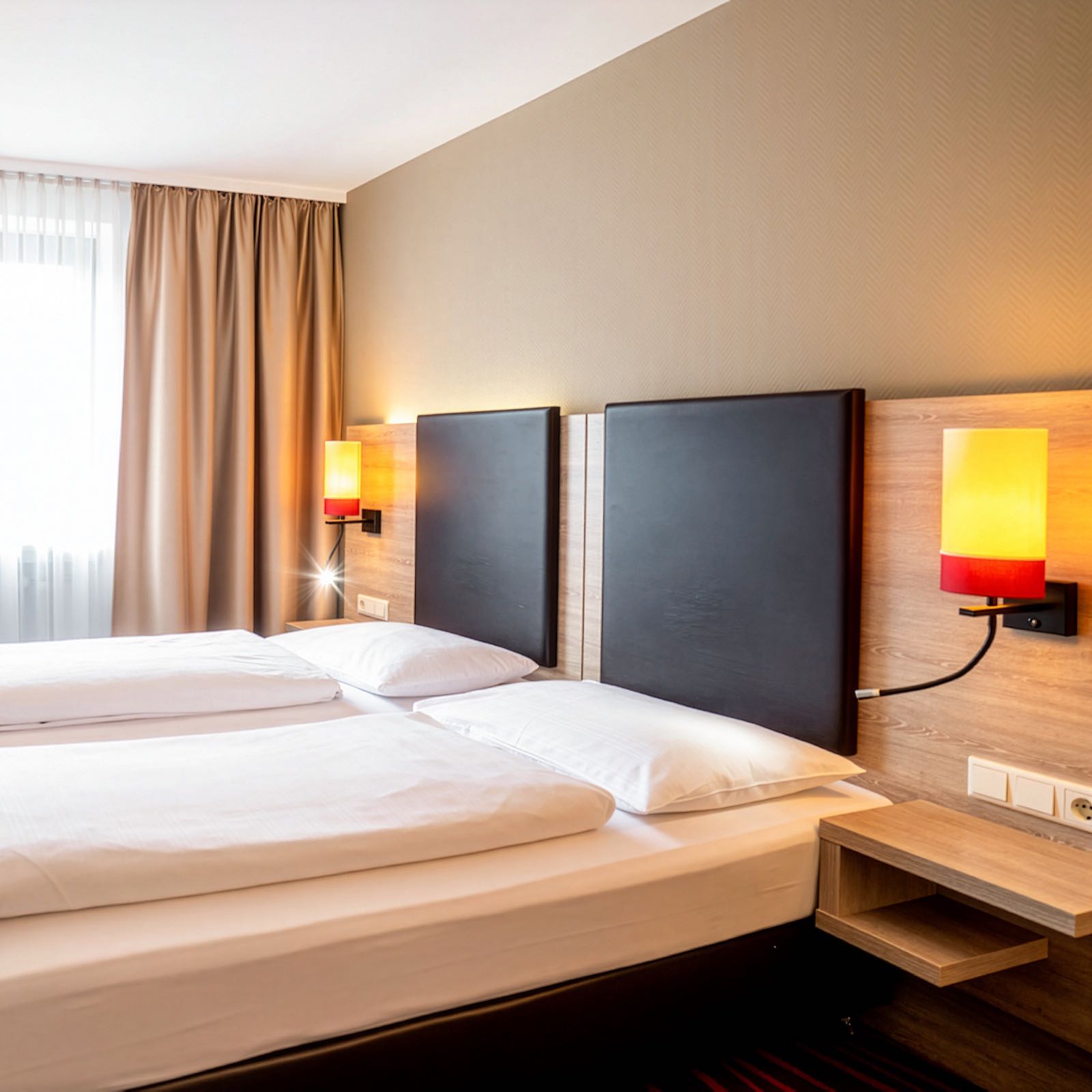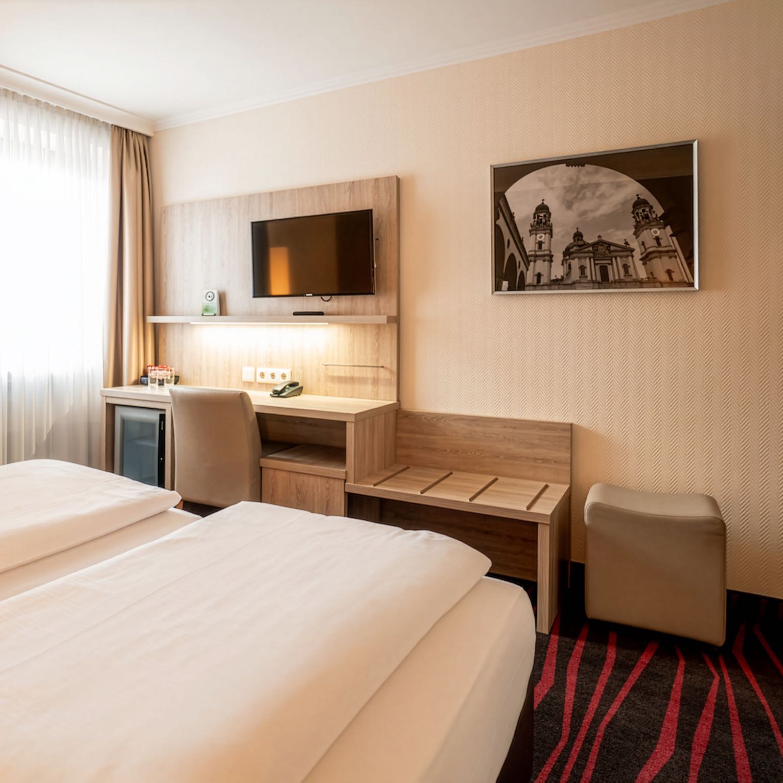 Im Doppelzimmer Zweibett City erwartet Sie ein Doppelbett mit 2 Einzelbetten (je 90 × 200 cm) und ein eigenes Bad mit Badewanne oder Dusche. Flachbild-TV, Safe, Mini-Kühlschrank (unbefüllt) und WLAN sorgen für Komfort und Flexibilität, sodass Sie sich nach einem langen Tag in München entspannen oder in Ruhe planen können. Ideal für längere Aufenthalte oder Reisen zu zweit.