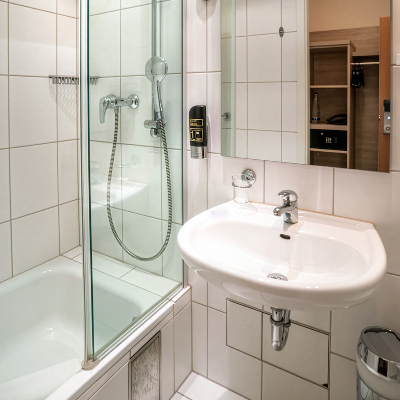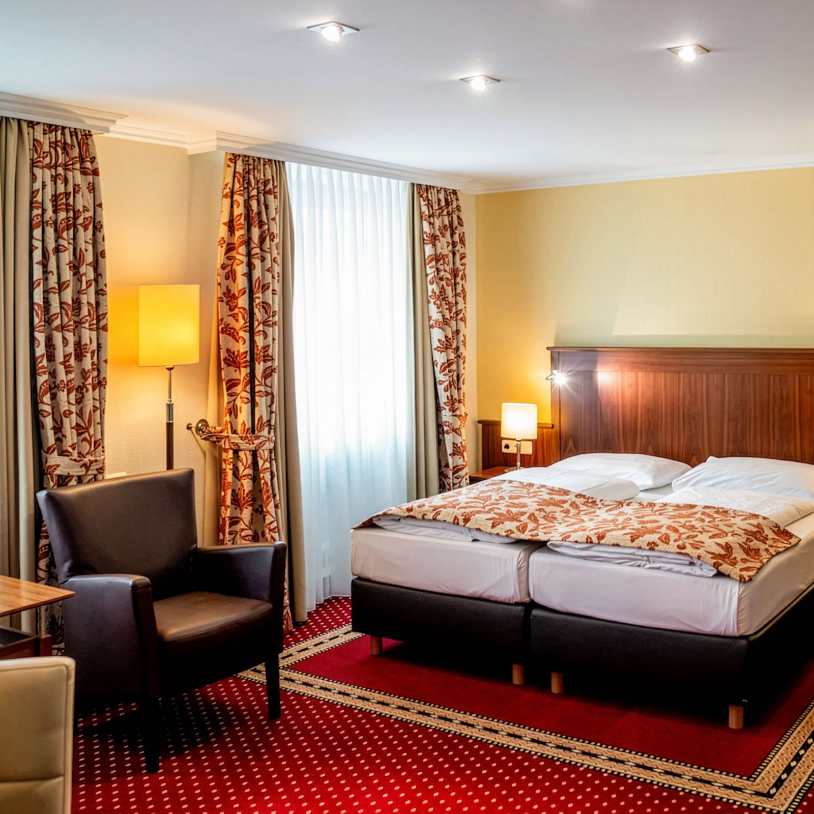 Im Doppelzimmer Zweibett Innenhof erwartet Sie ein Doppelbett, bestehend aus zwei Einzelbetten (je 90 × 200 cm), sowie ein eigenes Badezimmer mit Badewanne oder Dusche und WC. Flachbild-TV, Safe, Mini-Kühlschrank (unbefüllt) und kostenfreies WLAN runden die Ausstattung ab. Das Zimmer liegt ruhig zum Innenhof und bietet einen entspannten Rückzugsort, um nach einem ereignisreichen Tag in München ungestört zu entspannen – ideal für eine ruhige Auszeit mitten in München.