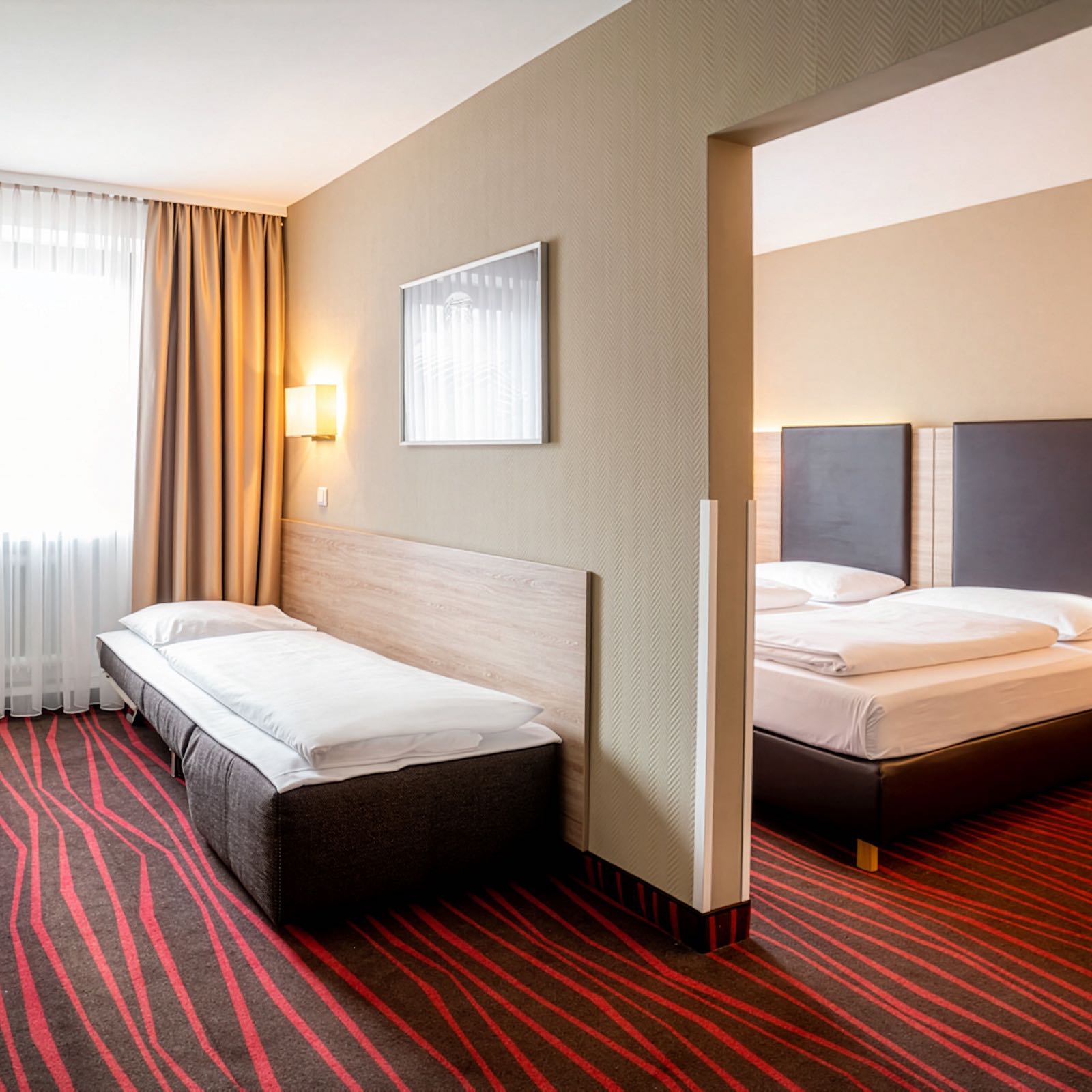 Auf 25 m² bietet das Dreibettzimmer City Platz für drei Personen mit einem Doppelbett aus zwei Einzelbetten (je 90 × 200 cm) und einer Schlafcouch (85 × 200 cm). Garderobe, Safe, Flachbild-TV, Mini-Kühlschrank (unbefüllt) und ein eigenes Bad mit Badewanne oder Dusche und WC runden die Ausstattung ab. Dank moderner Schallschutzfenster genießen Sie trotz der Lage zur Straßenseite Ruhe und Abschottung vom Stadttrubel – ideal für Familien oder kleine Gruppen.