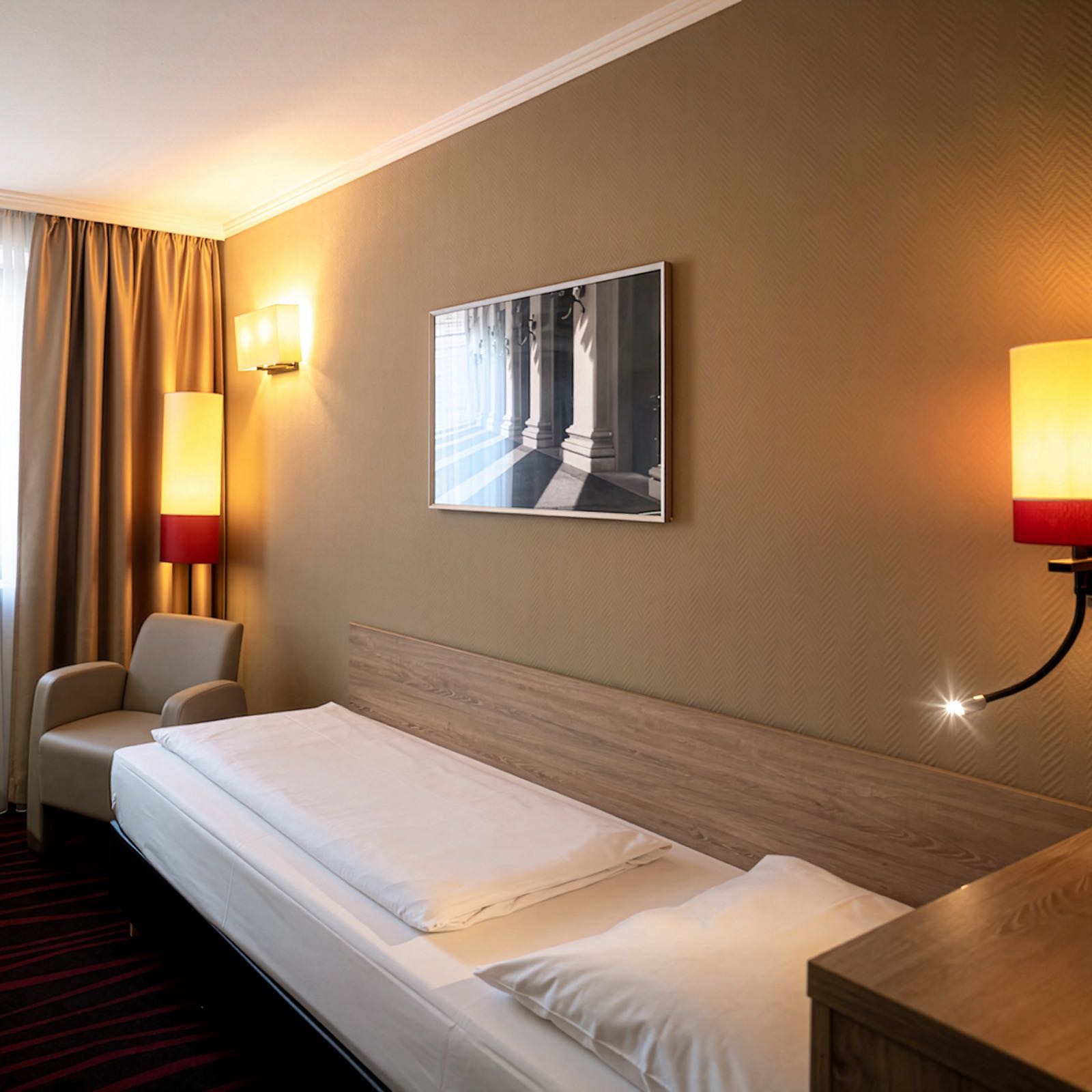 Das Einzelzimmer City überzeugt mit einer durchdachten Raumaufteilung und komfortabler Ausstattung: Ein Schreibtisch, kostenfreies WLAN, Flachbild-TV und ein Minikühlschrank zum Kühlen eigener Getränke machen Ihren Aufenthalt angenehm und praktisch.
